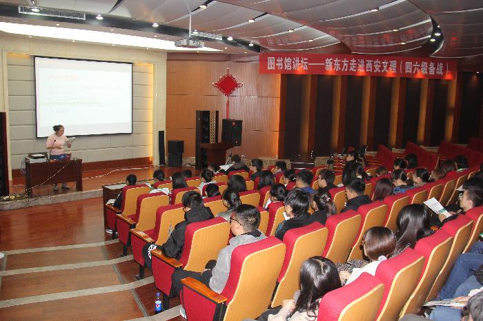 为帮助我校学生在即将到来的四六级英语考试中取得良好成绩,图书馆特邀新东方教育科技集团优秀教师卢青老师,于11月28日下午,在图书馆报告厅为同学们做了一场精彩的讲座。