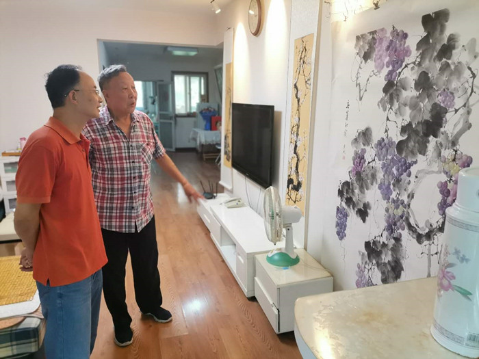 到原西安教院现教中心教师张秉诚家,范宏感谢张老师曾为我校和西安市现代教育技术事业所做的贡献,感谢张老师近年来积极参加学校和市上的画展活动对学校离退休工作的大力支持,希望老同志继续保持良好生活习惯,祝愿老同志健康快乐、安享晚年。