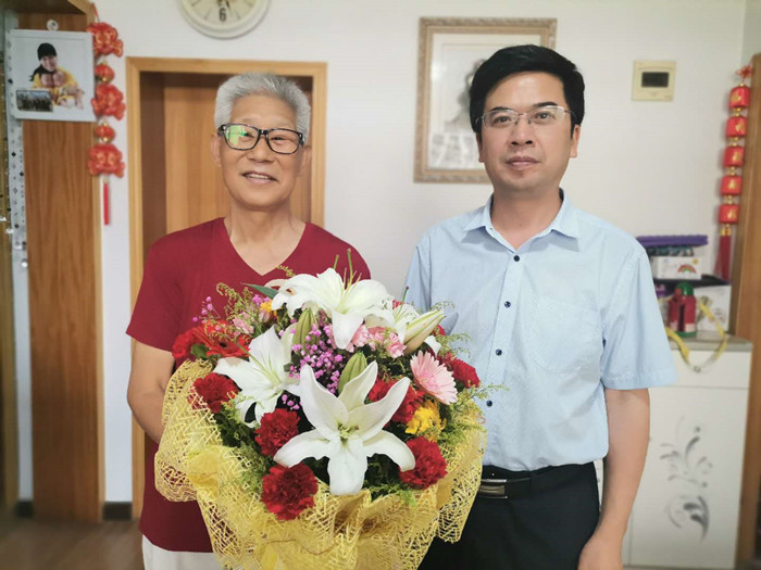 在原西安师范学校“西安市有突出贡献专家”高世雄家中,陈刚为高老师送上鲜花,亲切询问老专家的身体状况、退休生活和兴趣爱好,简要通报学校近几年在学科建设、科学研究、服务社会、校园基本建设等方面的情况,叮嘱老同志保重身体,祝愿老同志健康快乐。