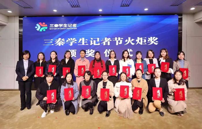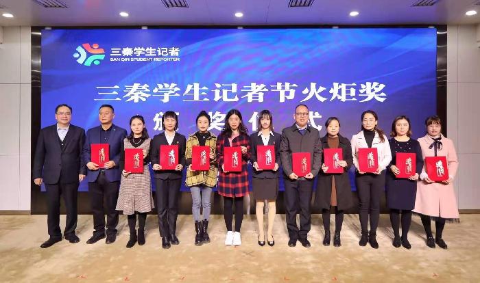 上午的采访活动结束后,师生一行乘车赶往西安市第三中学主会场,参加表彰活动。我校共有5人次师生受到表彰。马克思主义学院杨静老师荣获2020年度陕西省思政课教学“三秦学生记者”社会实践活动“火炬奖”一等奖,宣传部王莉老师荣获“火炬奖”二等奖,马克思主义学院院长张军学荣获突出贡献个人奖,王莉老师荣获先进个人荣誉称号,马克思主义学院思想政治教育专业1902班王旭同学获十佳三秦学生记者荣誉称号。我校艺术学院曹云老师指导学生在活动现场表演了精彩的节目。