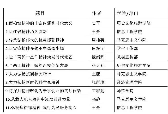 为进一步推动党史学习教育走实走深,发挥高校理论学习与研究优势,我校宣传部与西安日报“理论与实践”专版合作,推出“解读百年大党精神谱系”栏目。 从6月中旬到8月下旬,我校张天社等10名教师,共有11篇相关稿件在专栏推出,老师们围绕西柏坡精神,抗美援朝精神,“两弹一星”精神,西迁精神,科学家精神,探月精神,载人航天精神等伟大精神进行解读,进一步回顾党“雄关漫道真如铁”的光辉历程,展现党“人间正道是沧桑”的丰功伟绩,展望党“长风破浪会有时”的发展愿景。