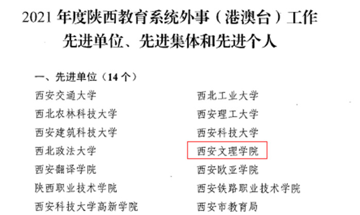 近日,省委教育工委、省教育厅下发《关于2021年度全省教育系统综合表彰的通报》(陕教工〔2022〕21号),西安文理学院荣获2021年度陕西省教育系统外事(港澳台)工作先进单位,国际交流处(港澳台事务办公室、国际教育学院)荣获2021年度陕西省教育系统外事(港澳台)工作先进集体,外事科副科长吕娜荣获先进个人。