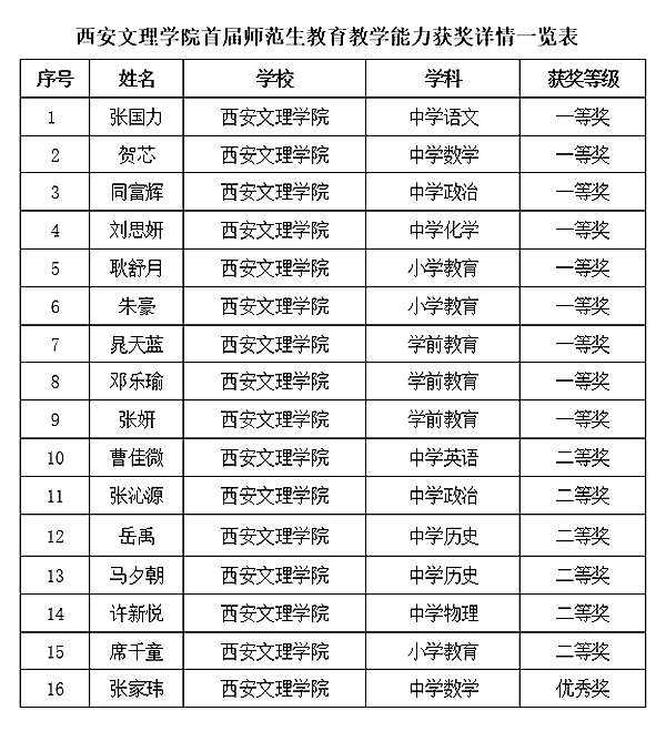 5月31日,由省教育厅主办、陕西师范大学教师教育处承办的陕西省首届高校师范生教育教学能力大赛决赛结果公布,我校16名参赛学生中,9人获得一等奖,6人获得二等奖,1人获优秀奖,一等奖获奖人数仅次于陕西师范大学,位居全省第二。
