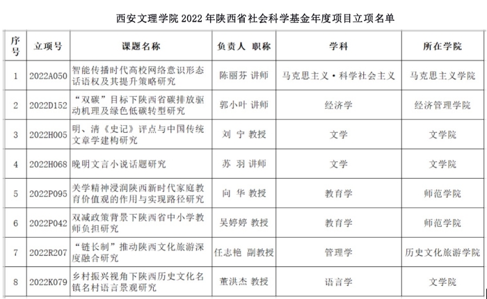 8月11日,陕西省哲学社会科学工作办公室公示了2022年度陕西省社科基金年度项目拟立项名单,我校拟获批8项,拟立项总数较去年提升显著。