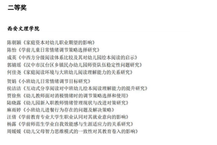 近日,由浙江教育报刊总社《幼儿教育》编辑部主办的第十六届全国高校学前(幼儿)教育专业优秀毕业论文评选活动结果揭晓。我校学前教育学院2022届毕业论文共有42篇获奖,其中,二等奖13篇,三等奖29篇。