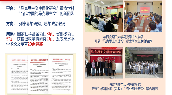 近年来,我校马克思主义学院对标省级重点马克思主义学院建设标准,通过推动思政课守正创新,落实“立德树人”根本任务;贯彻新文科理念、提升思想政治教育本科专业水平;规范学科建设、培育凝练特色研究方向,坚持服务地方、广泛开展理论宣讲和培训,将建设具有鲜明“文理特色”,优势突出的省级重点马克思主义学院作为发展目标。学院围绕最懂西安的城市大学的办学定位以及 “师范做优、文史做强、工管做特”的学科专业布局,内设“西安廉政研究中心”“西安红色文化传承研究中心”“西安市大中小学思政课一体化建设指导中心”3所研究机构和师德工作坊;与西安市政协、统战部共建2个决策咨询平台。