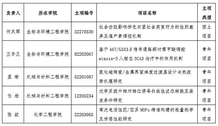 近日,国家自然科学基金委员会公布2022年国家自然科学基金项目评审结果,我校获批5项,其中面上项目1项,青年项目4项。