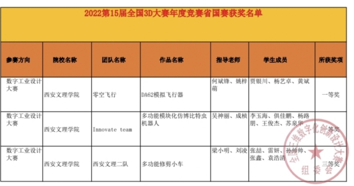 近日,由科技部、教育部、工信部、中国科协指导,国家制造业信息化培训中心等单位共同主办的第十五届全国三维数字化创新设计大赛(简称3D大赛)年度总决赛在线上成功举办,来自全国31个省、市、自治区,近600所院校参赛。我校机械与材料工程学院参赛团队表现优异,共获国家一等奖2项、三等奖1项,省赛特等奖3项、一等奖5项、二等奖2项、三等奖6项,成绩创历年新高。