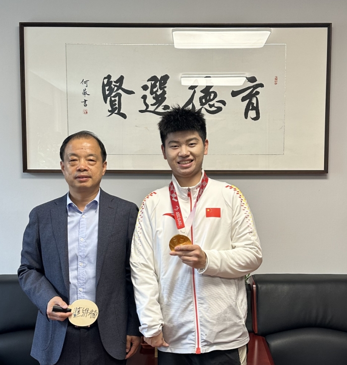 活动开始前,校党委书记王育选会见了彭伟楠。他提到希望彭伟楠本次的到来不仅为学生们带来乒乓球技术上的交流和指导,更要通过自身成长经历的分享感召大学生们,珍惜当下,遇到困难要有坚持、不抛弃、不放弃的信念,以刻苦拼搏的精神实现自己的人生理想。同时预祝彭伟楠在2024年巴黎奥运会取得好成绩,也定下了彭伟楠与文理的2024年之约。