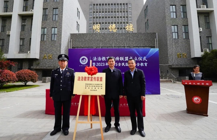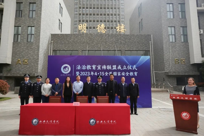 4月11日下午,学校与高新区丈八街道党工委、西安市公安局高新分局共同筹建的“法治教育宣传联盟”揭牌仪式在我校高新校区举行。市公安局高新分局党委副书记、政委许传彬,高新区党工委党群工作部副部长贺凯,高新区丈八街道党工委书记杨明,我校党委委员、校务委员曹鸿,党委委员、宣传部部长鲍锋出席签约仪式。仪式上,三方签订了《共建“法治教育宣传联盟”框架协议》,共同为“法治教育宣传联盟”揭牌。