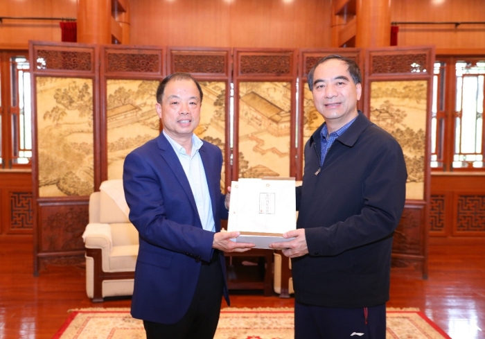 会后,王育选向龚旗煌赠送了学校纪念品--秦岭四库全书,双方领导在临湖轩前合影留念。