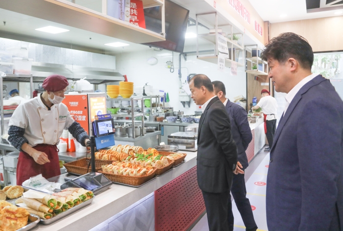 在学生食堂,王育选检查了食品原料和卫生情况,要求食堂负责人做到食品原料安全可靠、食堂卫生达标,要强化人员管理,严把食品安全关,确保校园食品安全。