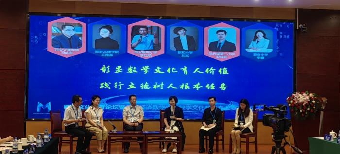沙龙研讨阶段,长安区绿地小学校长李正岐、西安新知小学校长刘岚、西安航天城第一小学副校长赵科利、西安小学副校长李娜、王雅荔共同就我市开展数学文化教育进行了对话交流。