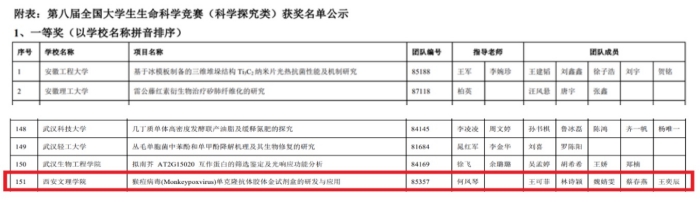 经过资格审查、网络评审和省级决赛,全国共评选出582个参赛团队参加全国决赛答辩。我校生物与环境工程学院蔡春燕、林诗颖、魏静雯、王可菲、王奕晨同学的项目《猴痘病毒(Monkeypox virus)单克隆抗体胶体金试剂盒的研发与应用》(指导老师:何凤琴)荣获一等奖。该项目在CULSC网评预赛中以93.87的成绩获得陕西省382支队伍中排名第一,并以陕西赛区决赛中第一名(特等奖)的好成绩晋级全国总决赛,最终喜获国家级一等奖的优异成绩。