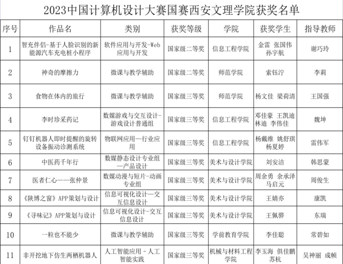 近日,2023年中国大学生计算机设计大赛全国总决赛结果公布,我校共有14支参赛队伍入围国赛,经过激烈角逐, 获得了国家级二等奖2项,三等奖9项的好成绩。