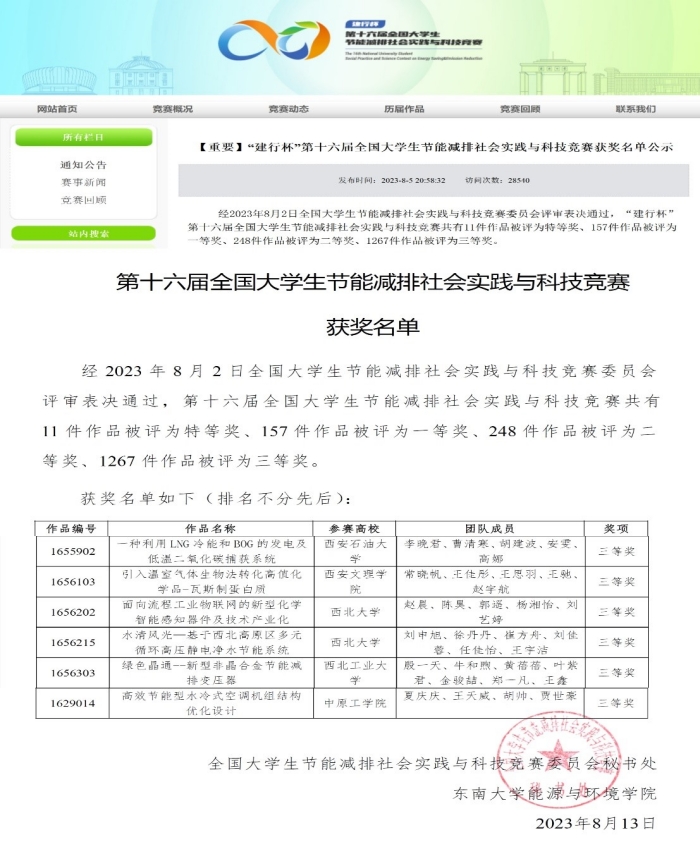 大学生节能减排社会实践与科技竞赛是由教育部高等学校能源动力专业教学指导委员会指导,全国大学生节能减排社会实践与科技竞赛委员会主办的学科竞赛。该大赛紧密结合“国家双碳”战略目标需求,起点高、规模大、精品多、覆盖面广,是一项具有导向性、示范性的全国大学生竞赛,已成为全国高校影响力最大的大学生科技创新竞赛之一。
