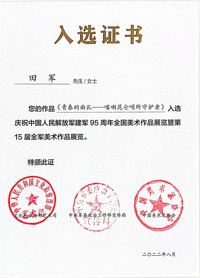 2022年8月,通过严格的初评、复评,田军创作的作品从来自全国的八千件作品中脱颖而出,入选由文化和旅游部艺术司、中央军委政治工作部宣传局、中国美术家协会主办的“庆祝中国人民解放军建军95周年全国美术作品展览暨第15届全军美术作品展览”并在北京中国美术馆展出。展览结束后,作为入选的优秀作品被中国人民革命军事博物馆永久收藏,是我校教师首次获此殊荣。