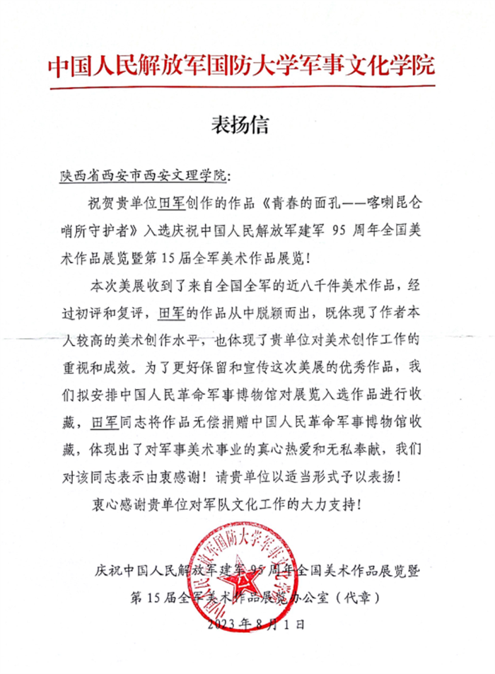 近日,我校收到第十五届全军美术作品展览办公室发来的表扬信,对学校美术与设计学院院长田军创作的作品《青春的面孔一一喀喇昆仑哨所守护者》美术创作水平给予了肯定,对该同志将作品无偿捐赠给中国人民革命军事博物馆收藏,对军事美术事业的真心热爱和无私奉献表示由衷感谢。同时,也衷心感谢我校对军队文化工作的大力支持和卓有成效的工作。