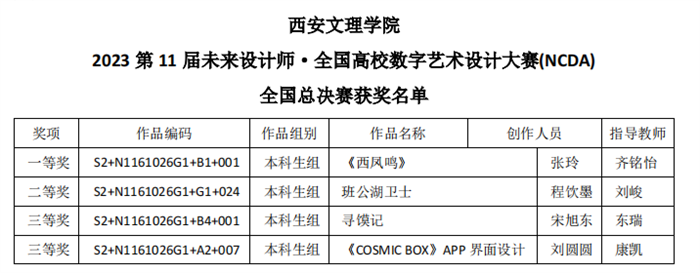 近日,2023年第11届未来设计师·全国高校数字艺术大赛(NCDA)全国赛区评选结果公布,我校美术与设计学院学子获得全国一等奖1项、二等奖1项、三等奖2项。在陕西省赛区我校美术与设计学院学生共获得22个奖项,一等奖6项、二等奖6项、三等奖10项。除此之外,我校还获评省赛“优秀组织单位”。由齐铭怡老师指导,学生张玲创作的《西凤鸣》,获得未来设计师全国总决赛一等奖;由刘俊老师指导,学生程饮墨创作的《班公湖卫士》获得未来设计师全国总决赛二等奖;由东瑞老师指导,学生宋旭东创作的《寻馍记》和康凯老师指导,学生刘圆圆创作的《COSMIC BOX》APP界面设计分别获得未来设计师全国总决赛三等奖。