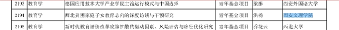 近日,全国教育科学规划领导小组办公室公示了2023年度全国教育科学规划立项课题名单,师范学院副教授耿飞飞主持的《新时代西部乡村教师內源式专业发展模型构建与支持体系研究》获批教育部重点项目。教育部社科司公示了2023年度教育部人文社会科学研究规划基金项目评审结果,师范学院博士教师洪杨主持的《西北贫困家庭子女教育志向的深度访谈与干预研究》获批青年项目。